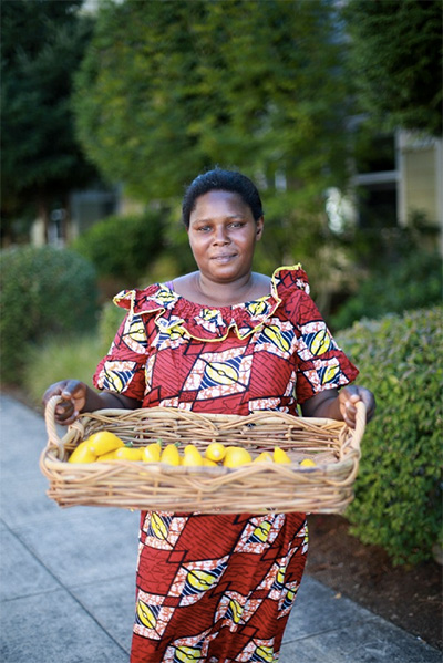 The ethnically Hutu Burundi woman arrived with her husband Prosper and five children in the United States in 2009 from a refugee camp in Tanzania, where she lived “for 12 years without hope of life for all my generations,” she says. She speaks Kirundi, the official language of Burundi, and Swahili, which she uses with her interpreter, Village Gardens staffer Eca-Etabo Wasongolo, and a bit of English.