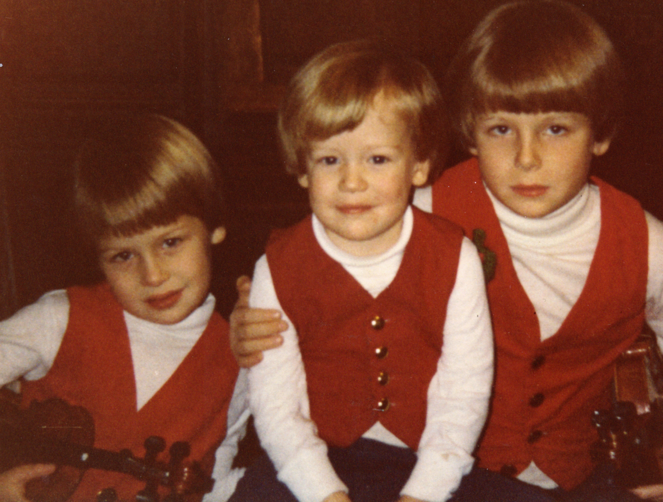 My parents brought me and my brothers up playing violin in orchestras and at folk music workshops, things called “Pickin & Grinnin.” We occasionally, begrudgingly, dressed up in red vests and held violins (pictured, at right).